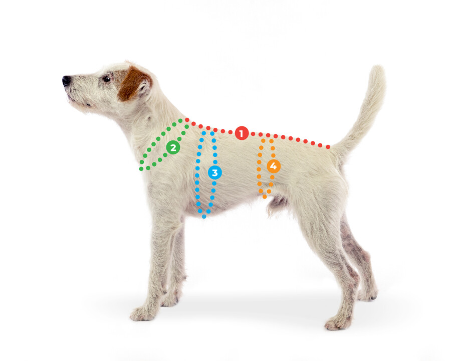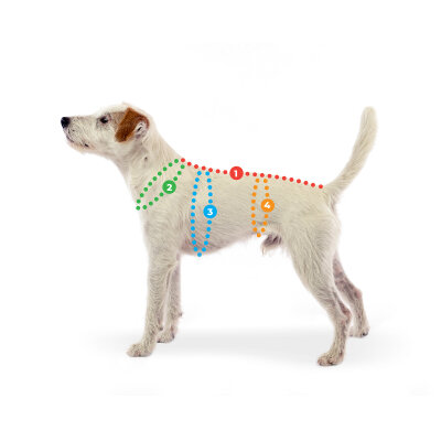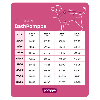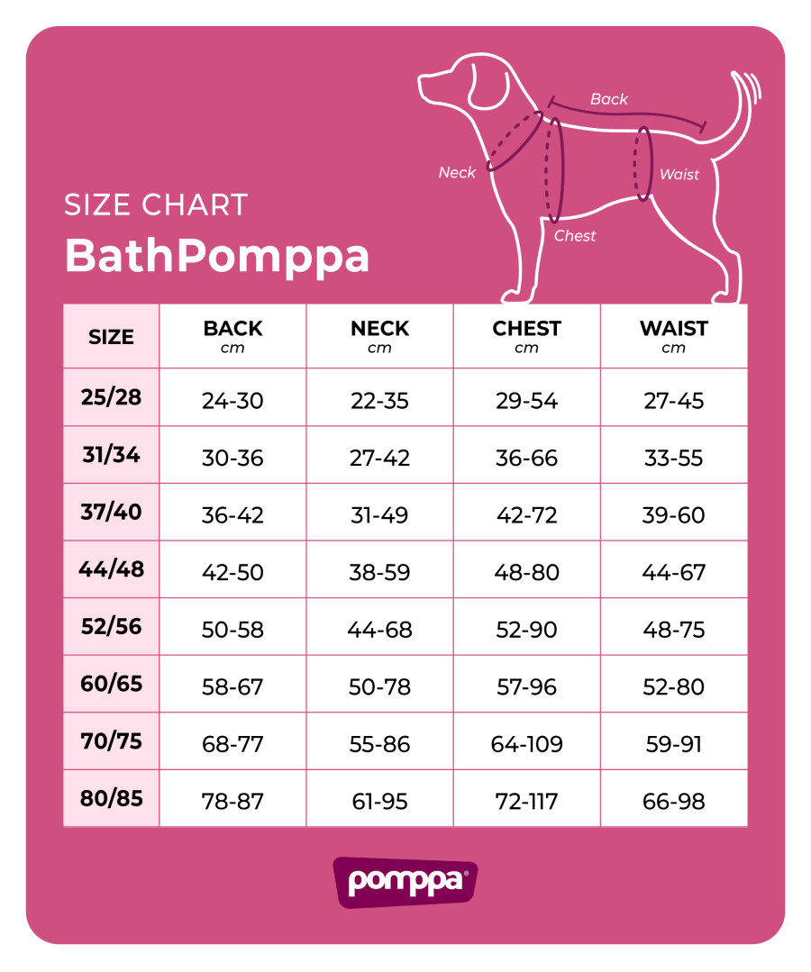 Velikosti BathPomppa temeljijo na dolžini hrbta psa. Za najboljše prileganje izmerite dolžino hrbta, obseg vratu, prsnega koša in pasu.