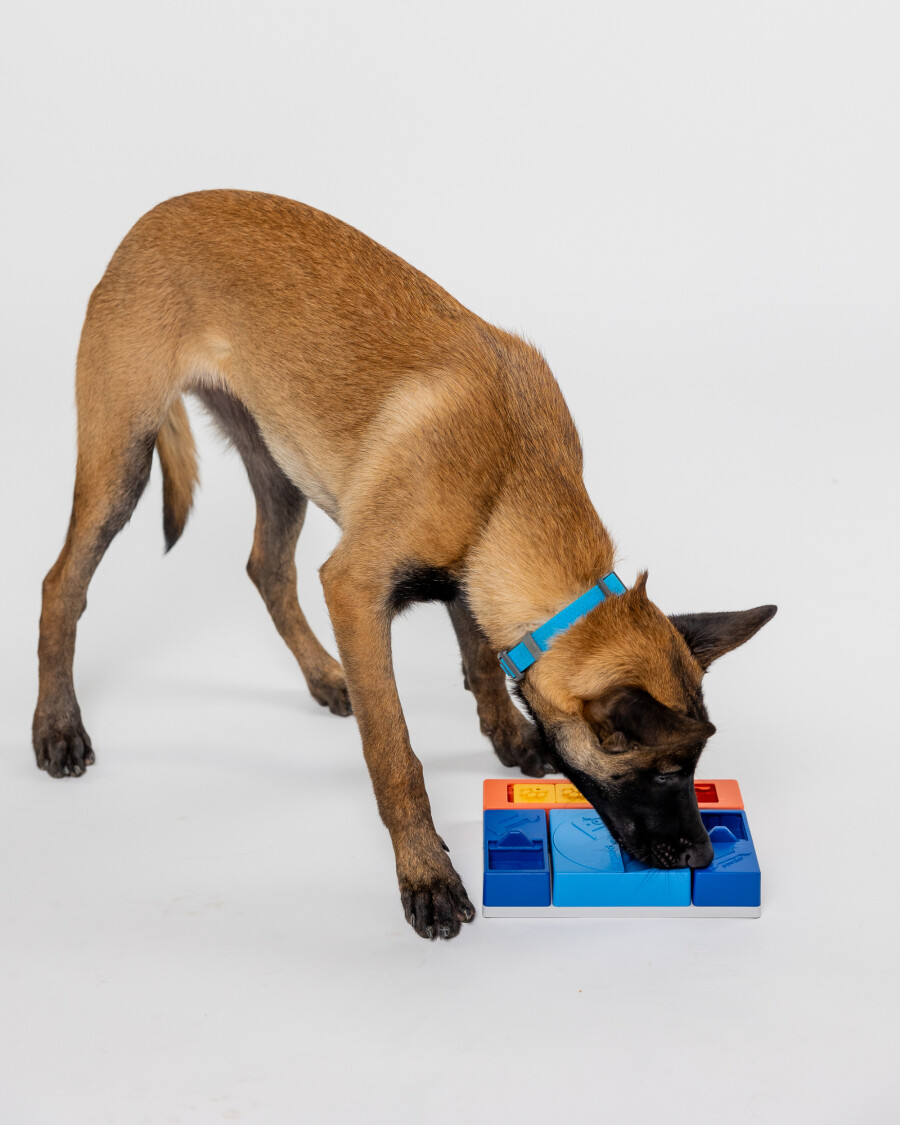 Beginner Set je pasji puzzle, zasnovan za ure zabave in mentalne stimulacije. Prilagojen je mladičkom in psom, ki se prvič srečujejo s puzzli, saj vključuje pawzle prve stopnje, kar je popoln uvod v interaktivno igro. Set za začetnike vsebuje mehanizme za skrivanje priboljškov, vključno s potiskanjem drsnika in obračanjem pokrova, kar spodbuja spretnosti vašega psa pri reševanju težav z udobnim tempom. Poleg tega vključuje posebno podlogo za lizanje za dodaten užitek. Vsak set vsebuje vsaj eno osnovo, ki drži posamezne pawzle. Predalčke lahko napolnite s priboljški, običajno pasjo hrano ali celo namažete z arašidovim maslom.