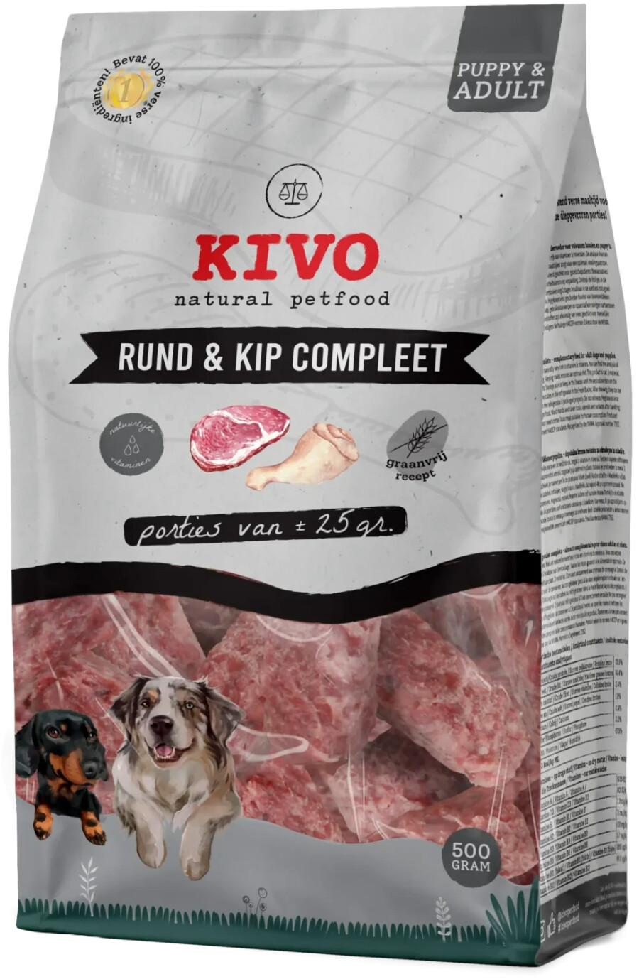 | Deklaracija izdelka | Popolna surova krmna mešanica za odrasle pse z govedino in piščancem. 70 % mišičnega mesa: piščančje meso, goveji obrezki, goveje srce. Analiza: Surove beljakovine: 15,2% |